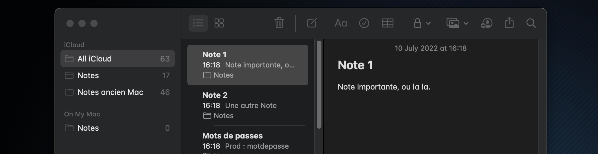 Les notes peuvent être stockées directement sur le Mac, cette caractéristique empêche le partage de la note entre les appareils, mais permet un chiffrement et une protection par mot de passe. On sait que la note est stockée sur le mac lorsqu’elle est dans la section “On My Mac” (“Sur mon Mac” en français). Si cette section n’apparait pas, tu peux l’activer depuis les préférences de l’application.